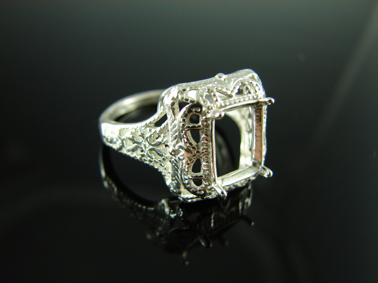 6090 STERLING SILVER FILIGREE RING SETTING, 9X7 MM EMERALD CUT FACETED GEMSTONE, SIZE 8.5