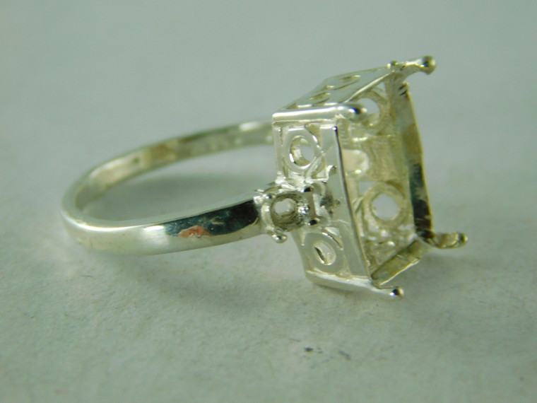 sterling silver three stone ring that takes a 12 x 10 mm emerald cut stone in the center and and 2 2.5 mm stones for accents